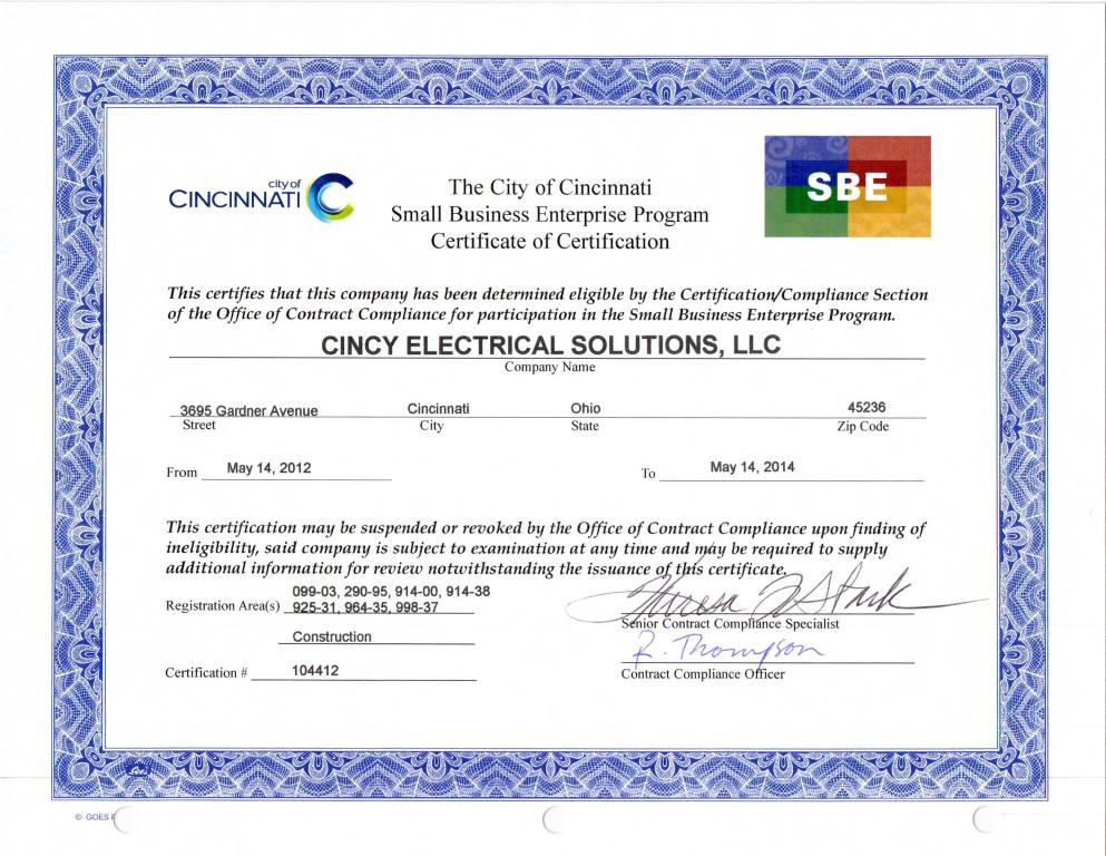 Cincy Electrical Solution, LLC, is fully certified as a SBE (Small Business Enterprise) by the City of Cincinnati. We are also registered as a small business with the Hamilton County Office of Small Business Development. We welcome the opportunity to partner with larger contractors to meet your SBE goals. |